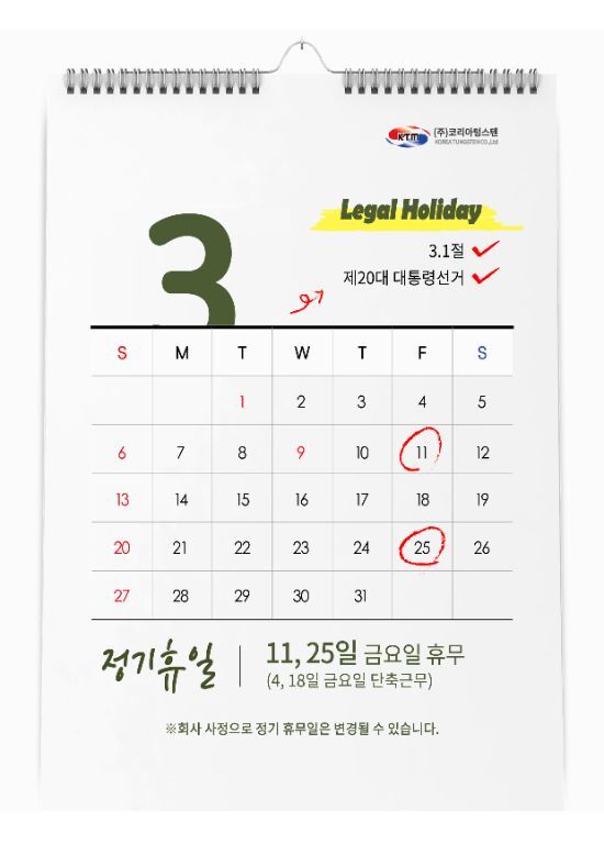 코리아텅스텐 2022년 3월 정기휴무 안내