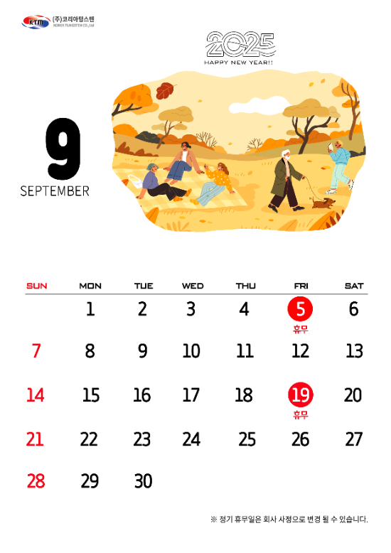 코리아텅스텐 2025년 9월 휴무 안내